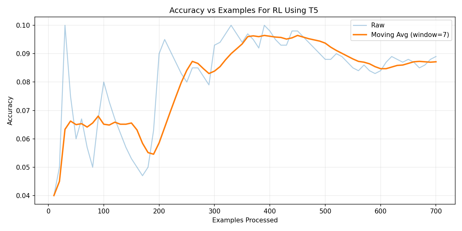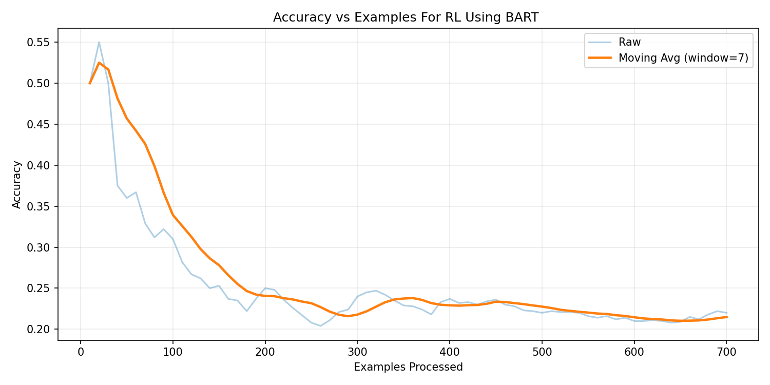 | T5-base | ~16% | Unstable | Higher parameter count increased computational cost significantly. Training was slow and prone to hallucinated outputs, especially under reinforcement learning. |