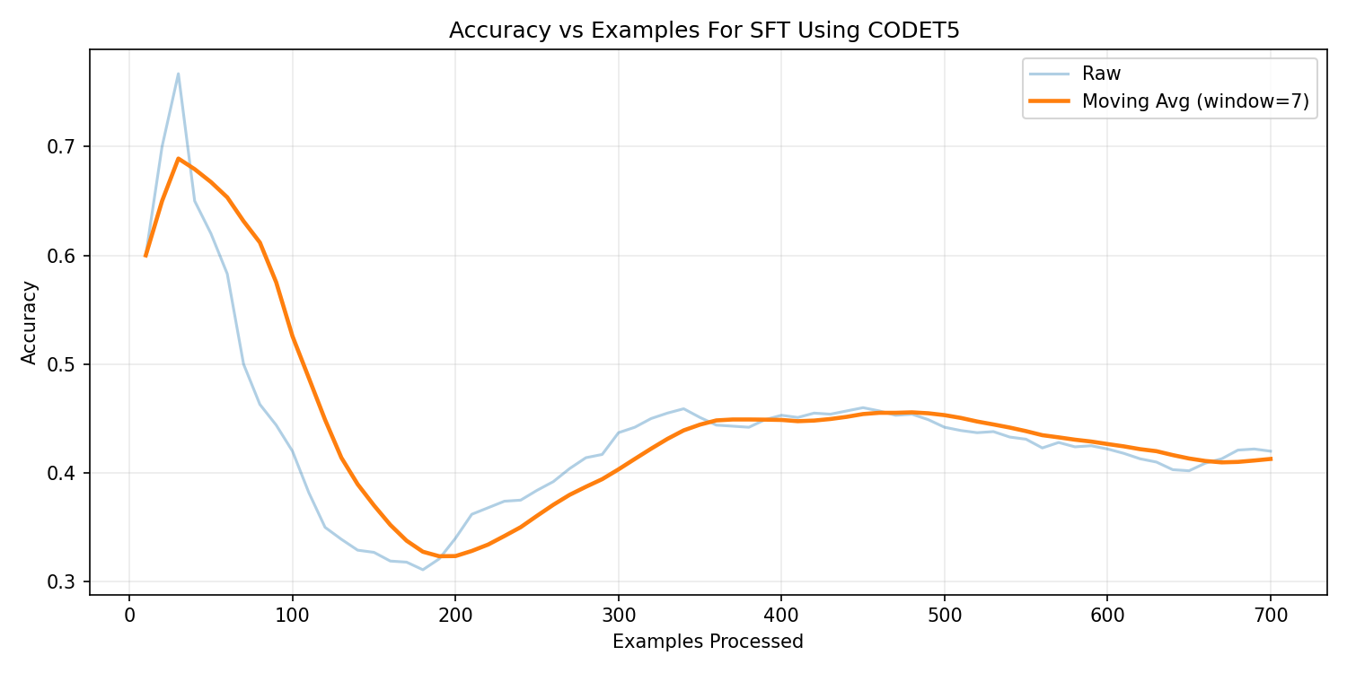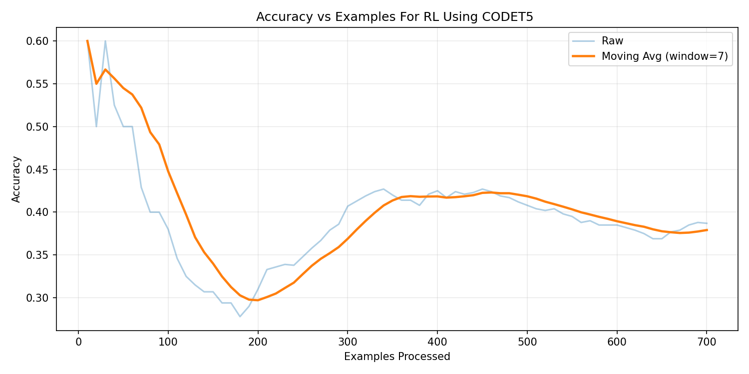 | CodeT5-base | 41.7% | 37.9% | Pretrained on programming languages, enabling stronger structural reasoning and SQL syntax awareness. Demonstrated superior consistency in query generation and more stable RL fine-tuning behavior. |