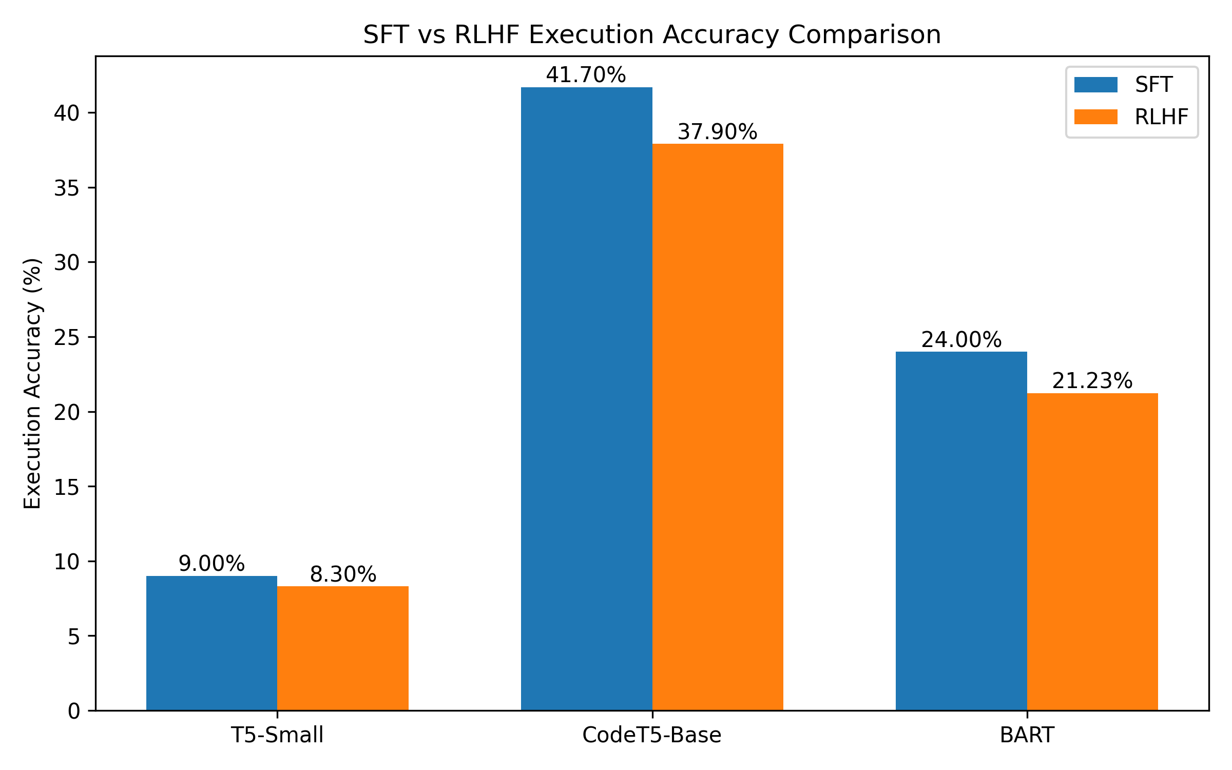 The supervised baseline achieved 9.0% execution accuracy. RLHF provided limited improvement (~8.3%) and suffered from instability due to sparse reward signals.
